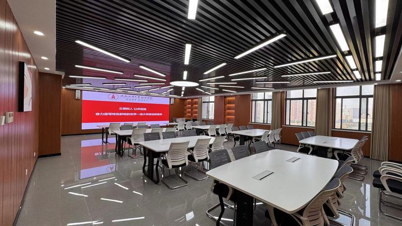 国际贸易实训/Mooc平台位于科教楼B座1104室,使用面积140m2,配有联想ThinkserverRD650服务器1套,华为S5700-24TP-SI交换机2台,京东方BTQ015显示屏1套,多媒体中控系统1套,音响系统1套,教师多媒体控制台1套,谈判桌椅6套,学生椅50把。