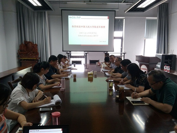 6月1日上午10点,中国人民大学教授、博士生导师陈甬军在建艺馆705会议室与必赢官网教师见面,就学科学位建设以及国际合作办学进行交流研讨。必赢优惠y272net院长吴华清,副院长晋盛武、张先锋,党委副书记胡晓浩,国际合作办学协调小组成员、经济学系相关老师参加了此次研讨。吴华清院长主持此次研讨会。