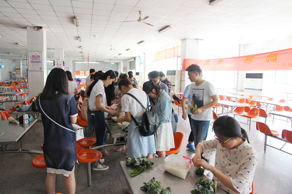中午一点半,伴随着粽叶淡淡的清香,包括留学生在内的16级研究生们就簇拥在四食堂内,桌上满满地放着糯米、粽叶、蜜枣等原材料,在几位同学的指导下,大家相互帮助,很快就拿出了自己的成果,现场笑声连连,包好的粽子在煮熟后,分发给了学院老师和研究生们,每一个粽子都是同学们对于端午浓浓的纪念之情。