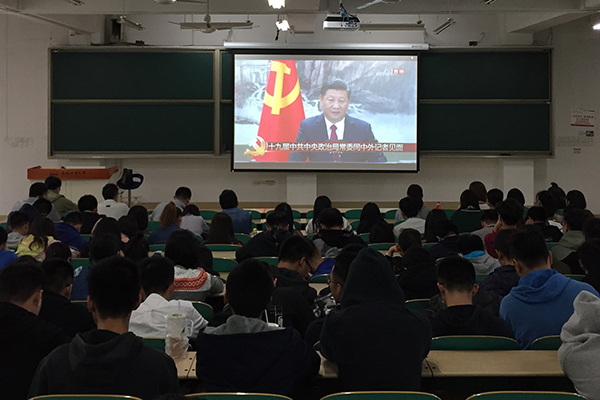10月25日上午11时45分许,第十九届中共中央政治局常委同中外记者见面会在人民大会堂东大厅举行。必赢优惠y272net组织师生集中收听收看见面会直播。在翡翠湖校区科教楼东楼1208会议室、3教102教室,学院领导班子成员、各系和机关党员干部、教职员工及本科生近三**集中收看了见面会。