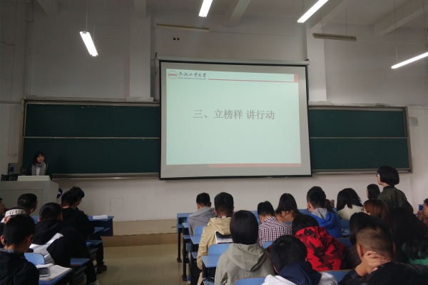第三部分是“立榜样·讲行动”。首先,已经保研至中央财经大学的2014级郑悦同学从高数学习、大学四年应有的规划和重难点课程三方面向学弟学妹们分享了自己的经验。她建议大家充分结合实际规划人生目标,扎扎实实实现阶段计划,把握好大学时光。在之后的提问环节中,学生们表现踊跃,向郑悦同学提出了自己对现阶段、对未来的种种问题,而郑悦同学均一一耐心解答。最后,辅导员叶荣菁带领2017级学生宣读了《考试诚信承诺书》,再次强调应严守考风考纪,并祝大家能在期中考试中取得好成绩。