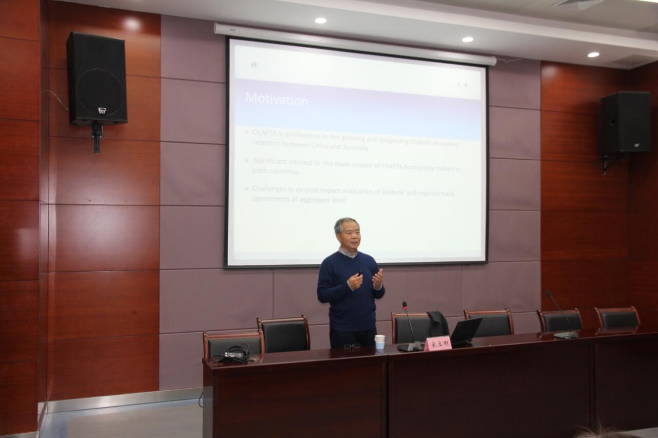 2017年12月1日,澳大利亚国立大学克劳福德公共政策学院教授、博士生导师、中国经济项目负责人宋立刚教授应邀来必赢官网进行学术访问交流。当天上午8:40-10:30,宋立刚教授在必赢优惠y272net翡翠湖校区科教楼A座第五会议室,以“澳大利亚-中国自由贸易协定对双边贸易影响的统计分析”为主题为全院师生做了一场精彩的学术报告。本次报告会由必赢优惠y272net副院长张先锋教授主持,学院师生近**参加了此次报告会。