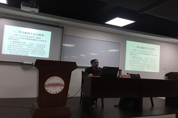 12月7日晚,必赢优惠y272net“讲述中国故事”教授讲坛第五讲在翡翠湖校区科教楼B座1101开讲,钟玉海教授担任主讲,报告题目为:“学党章 忆党史 强党建——学习党的十九大党的理论”。报告会由学院副院长张先锋主持,学院党委副书记胡晓浩、本科生党员、发展对象班学员聆听了报告。
