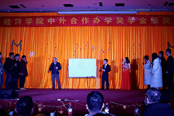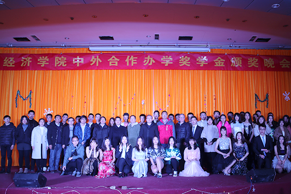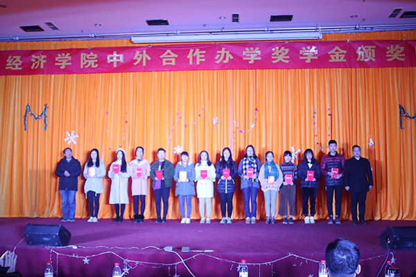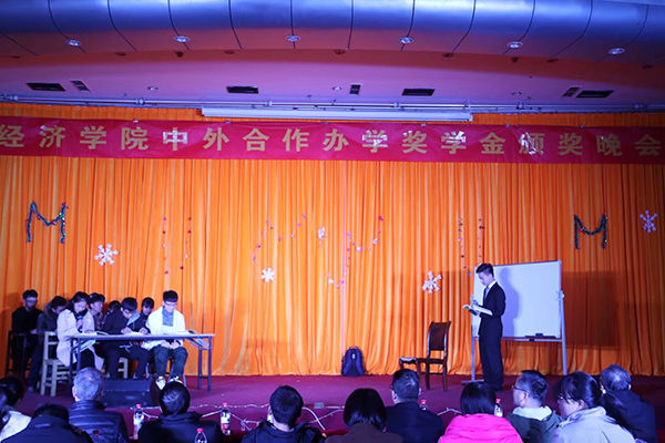 为鼓励同学们勤奋学习,积极进取,同时对学习优异、品行端正和综合能力突出的优秀同学进行表彰,12月22日晚18:30,必赢优惠y272net国际经济与贸易专业(中外合作办学)奖学金颁奖晚会在翡翠湖校区综合楼301室隆重举行。校团委副书记陈竹,校党委学工部李志明、朱大勇及必赢优惠y272net师生200余人参加颁奖晚会。