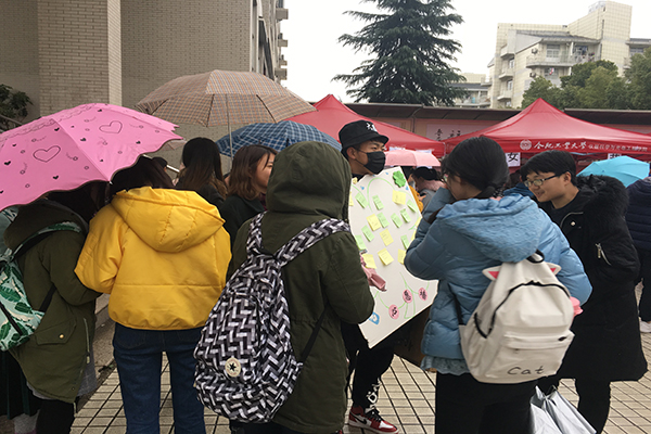 本次活动共有四个环节,分为心愿墙、小邮局、闺蜜了解大考验以及说歌词猜歌名。活动现场同学们积极参与,气氛热烈。在心愿墙环节,工作人员邀请来往的女同学在心愿墙上写下自己的心愿,而路过心愿墙的同学也不忘驻足观看,有的同学还主动取走卡片帮助女同学实现愿望。在小邮局环节,同学们将自己想对他人说的话书写在明信片上,最终将由工作人员代替送出。在闺蜜了解大考验环节,由两名同学共同完成游戏,每一对同学的表现都很好,体现了闺蜜之间的信任与深厚的友谊。在最后的说歌词猜歌名环节,参与游戏的同学更是积极发挥聪明才智,快速搜索大脑曲库,大家最终也都取得了不错的成绩。
