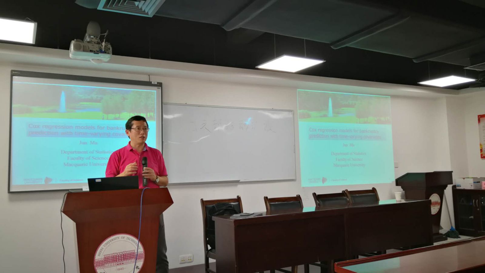 2018年5月17日下午四点,在必赢优惠y272net翡翠湖校区科教楼B座1101会议室,开展了一场由澳大利亚麦考瑞大学统计学院马骏副院长带来的关于“具有时变协变量的破产预测的Cox回归模型”的学术交流会。必赢优惠y272net金融研究所所长朱卫东、数量经济研究所所长谭常春、MF中心主任张根文以及必赢官网部分本科生、研究生参加了本次交流会。