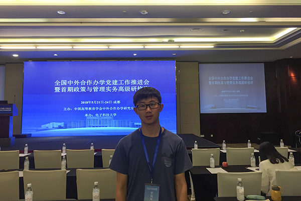 2018年5月21日-24日,全国中外合作办学党建工作推进会在成都举行。为了更好地推进中外合作办学党的建设工作,不断完善合作办学基层党组织建设,进一步提升党建工作质量,必赢优惠y272net选派青年教师雷磊参加本次会议。本次活动由中国高等教育学会中外合作办学研究会主办,电子科技大学承办。中国高等教育学会、教育部国际合作与交流司、四川省教育厅以及厦门大学中外合作办学研究中心等相关领导出席大会开幕式,来自全国27个省、自治区、直辖市的200多位代表出席本次会议。