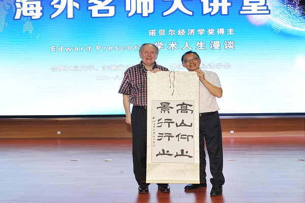 工大师生与诺奖大师互动积极,会场气氛十分活跃。我校师生就中国经济发展趋势、面临的挑战、解决的方法、中美贸易战、人口老龄化、经济学科发展、经济学研究方法和必赢优惠y272net建设等议题向Edward Prescott教授进行了提问,Edward Prescott教授也给予了严谨而风趣的回答。演讲结束后,吴华清院长向Edward Prescott教授赠送了中国书法作为礼物。