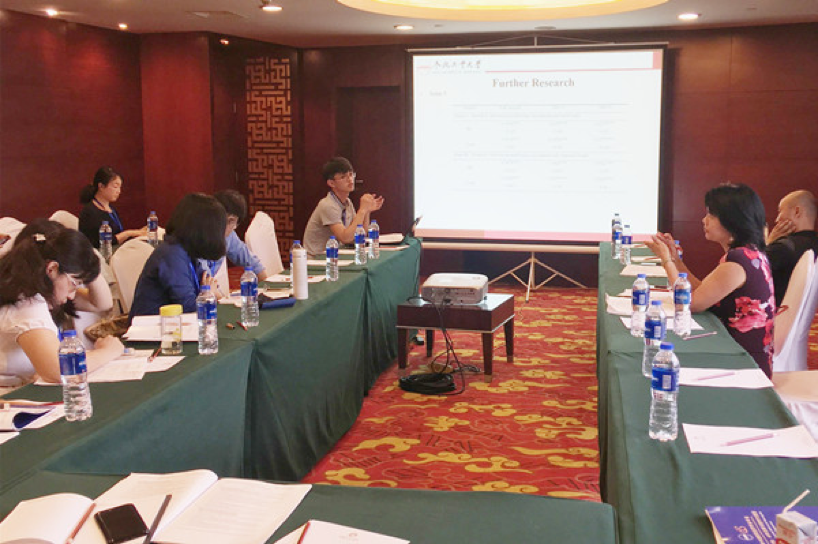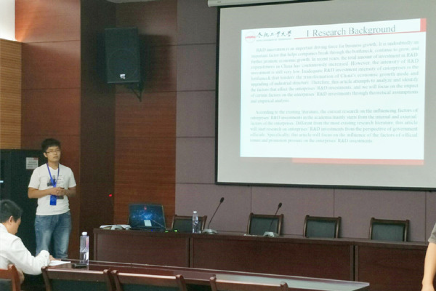 研究生李冠中在以“产业组织”为主题分论坛,做了题为“官职、晋升压力和企业研发”的合作论文汇报。