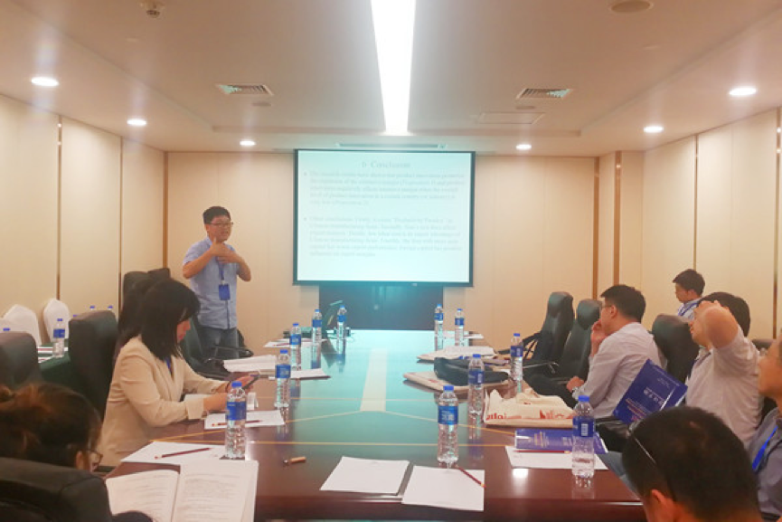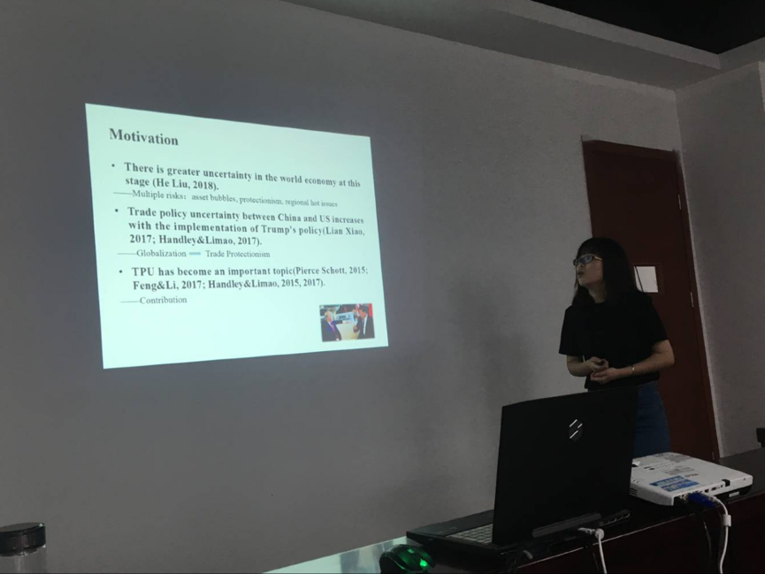 研究生裴斐在以“国际经济学”为主题分论坛,做了题为“贸易政策不确定性,企业异质性和出口模式”的合作论文汇报。