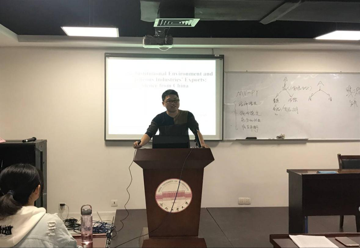 2018年11月1日晚上7点,必赢优惠y272net吴飞飞老师在翡翠湖校区科教B座1101会议室给2018级研究生做了一场学术报告,本次报告的主题是“Domestic Institutional Environment and Heterogeneous Industries' Exports:Evidence from China”。