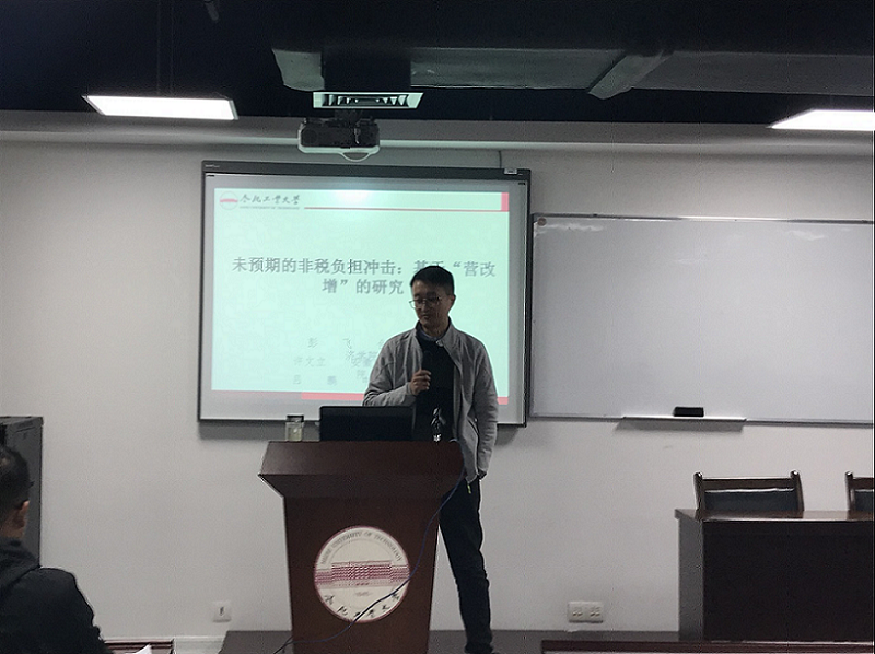 2018年11月8日晚上7点,必赢优惠y272net彭飞老师在翡翠湖校区科教B座1101会议室给2018级研究生做了一场学术报告,本次报告的主题是“未预期的非税负担冲击:基于'营改增'的研究”。