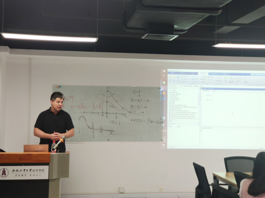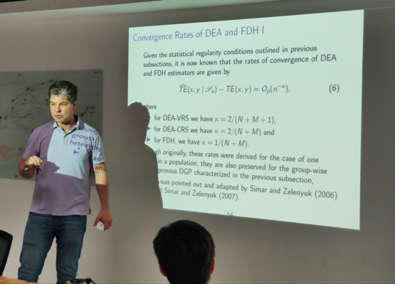 为期三天的研讨班内容丰富,既有基础理论讲授和研究前沿进展报告,又有编程实践和论文研讨,前后共进行了八场讲座。基础理论部分主要讲授生产率相关理论的基本知识,包括基于经济学视角的效率估计、DEA和FDH的统计性质以及效率分布的统计检验方法。针对不同的统计量,Valentin Zelenyuk教授分别介绍了相应统计检验方法并对比了各种方法的优劣、前提假设、用法等方面的异同。