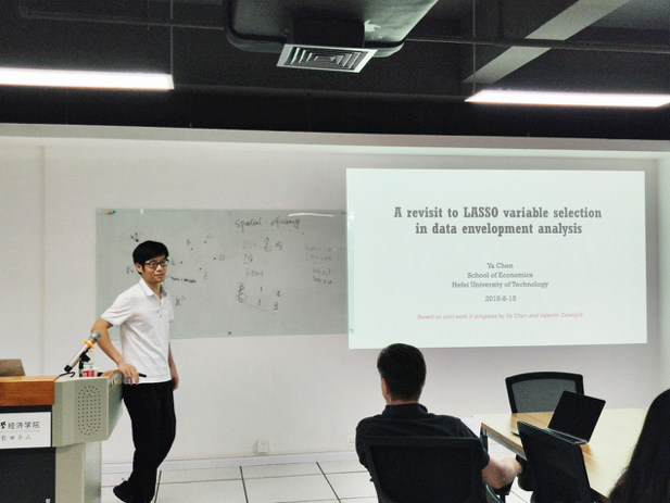 为了加强与Valentin Zelenyuk教授的学术研究合作,周志翔老师、陈亚老师和黄西蒙同学分别作了工作论文汇报。周志翔老师汇报了其空间数据包络分析的最新工作论文,详细介绍了论文的研究动机、主要贡献和结果,陈亚老师汇报了其与Valentin Zelenyuk教授最近合作的工作论文——基于LASSO变量选择的数据包络分析,黄西蒙同学汇报了基于弱可处置性的全要素水能效率和环境效率分析的论文。汇报结束后,Valentin Zelenyuk教授进行了精彩点评,并和与会师生共同探讨了论文改进建议和进一步可能的合作。
