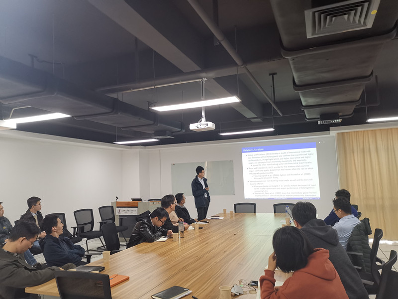 第三场讲座由蒋为副教授报告,主题为“Bank Competition and Export Quality Upgrading”。蒋为副教授首先对传统国际贸易模型进行拓展,理论推理了银行业竞争如何影响出口产品质量提升。然后利用出口细分产品数据和银行披露信息,实证检验了银行竞争对出口产品质量的影响。研究表明,银行竞争程度越高,越有利于产品出口质量的提升。结论对新兴经济体如何改善银行竞争效率,提高产品出口质量具有重要指导意义。讨论会上,李静教授对数据的来源与处理、刘冲博士对模型构建的细节、彭飞老师对工具变量方法的运用与蒋为副教授进行了热烈的讨论与交流。