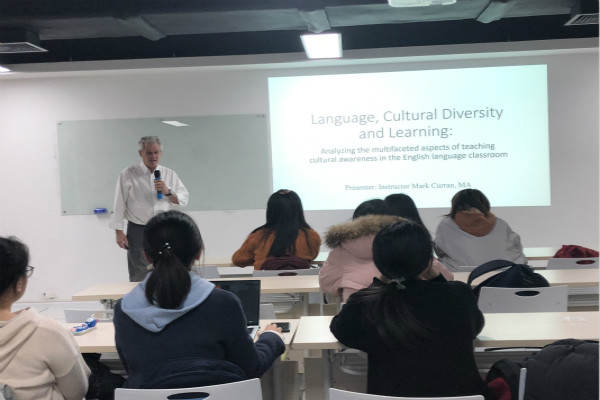 Mark Curran首先指出学习一种语言的目的不仅仅是学会这种语言,也是在学习一种文化。其次,他通过讲述自己的一些亲身经历指出语言和文化紧密相连,对于我们日常交流有重要作用。并且通过对比中国与美国的教育差异论述了文化多样性的重要性。最后和同学们分享了“如何融入一种文化”的心得体会。