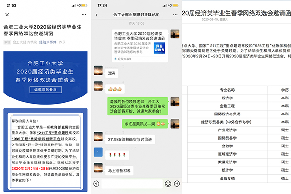 在前期充分调研毕业班学生就业意向和职业需求的基础上,2月15日,学院在全校率先发出2020届经济类毕业生春季网络双选会邀请函,邀请企业开展线上招聘。信息发布后的短短3天之内,就陆陆续续收到了国内20余家优质企业报名参会,为毕业生提供就业岗位超过100个。