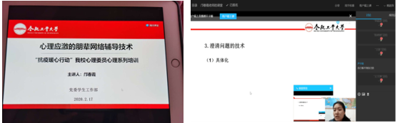 为了更好普及防疫心理健康知识,帮助学生提高在疫情防控期间的心理自助和助人能力,各级心理委员积极参与学校组织的“抗疫暖心行动”心理委员心理系列培训。在当前的特殊环境下,更要关注同学们的心理健康,运用积极心理学进行心理自治,增加对目前状况的理解度,提醒同学们要在合适的场所合理表达合适的感情和动作。对此2018级心理委员黄西蒙、熊进萍表示,“此次疫情不仅需要各位老师、同学的全力配合,还需要大家保持冷静,以良好的心理素质去面对,不信谣不传谣。通过这次心理培训,虽说掌握的心理知识不及老师专业,但可以有效缓解心理压力,并且可以更好地为班级同学服务,携手共渡难关。”