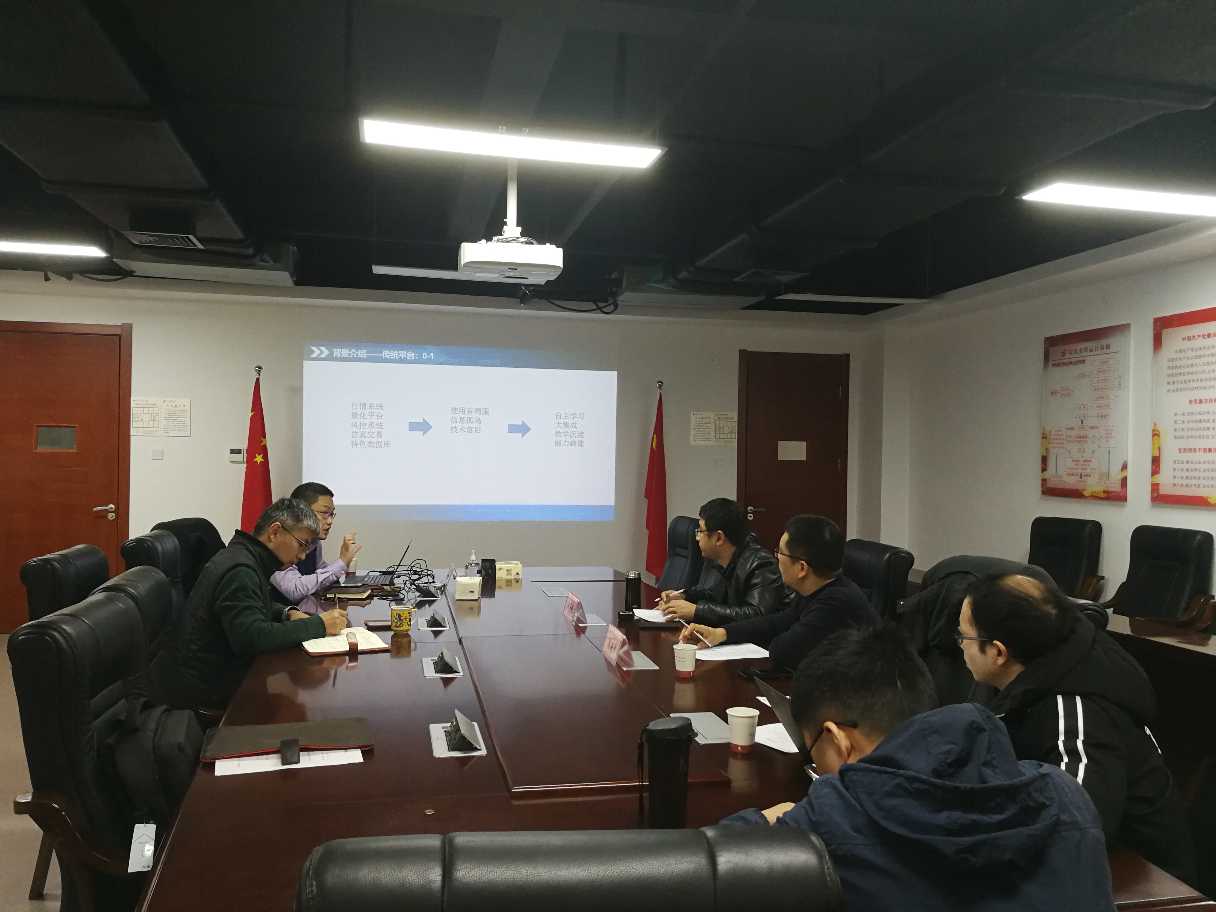 2020年12月12日,学院举行了金融综合实训平台项目验收评审会,邀请了中国科学技术大学金百锁、郭新帅和学院谭常春、吴文生、柯睿5位老师组成的专家组进行了项目评审验收。评审专家认真听取了上海知临信息技术有限公司总经理张坤明对金融综合实训平台功能及运行情况的汇报,审查了相关技术资料,进行了现场质询。评审专家认为该平台设计理念先进,能够有效地将现代教育技术与传统课堂教学相结合,在课堂教学和科研实践形式上均有创新,符合现代金融学发展的方向。项目执行和管理规范,建设和运行符合金融工程一流本科专业建设创新性发展的要求,一致通过了该项目的验收,并对该平台后期的建设和维护提出了宝贵的意见和建议。