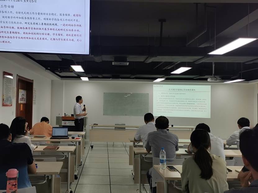 院党委书记张炳武介绍了2021年暑期工作的相关安排,提醒全体教工做好常态化疫情防控,注意实验室、网络、防火、水电事故等安全问题,增强校园安全意识和自我保护意识,特别强调了研究生暑期教育和管理工作,要求研究生导师准确掌握研究生暑期的离返校情况,加强指导学生科研和论文写作,关心学生的思想状况与实际困难。