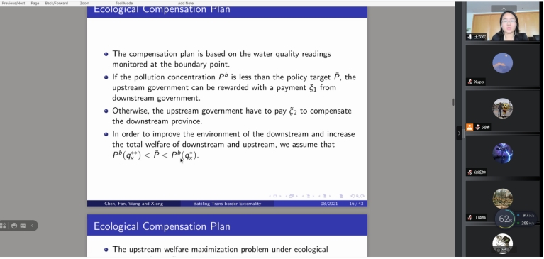 在第一场活动中,王欢欢教授首先汇报了工作论文“Battling Trans-border Externality: Evidence from Cross-jurisdictional Ecological Compensation in China”,报告由张先锋副院长主持。王老师以新安江的跨省污染治理为例,从理论与经验两个方面细致探讨了跨界外部性的应对之策。针对必赢官网师生对论文中模型构建与机制识别等提出的问题,王欢欢教授进行了耐心的解答。在第二场交流活动中,王欢欢教授就交叉学科的研究心得、Journal of Economic Surveys 期刊介绍、新文科与一流课程建设和全英文授课经验等三个方面进行了分享与交流。