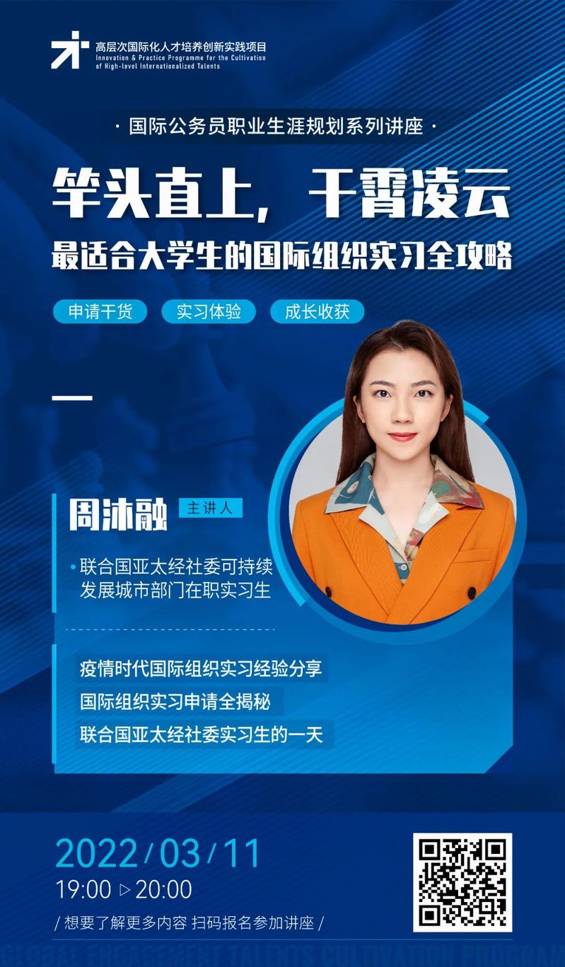 2022年春季学期国际公务员职业生涯规划系列讲座第三场,由联合国亚洲及太平洋经济社会委员会实习生周沐融担任讲座的主讲嘉宾,她将围绕申请干货、实习体验、成长收获三个关键词开展讲座。在专业理论学习,以及国际组织的申请与实习方面,周沐融积累了丰富的经验,也总结了一套适用性广的方法,将会让同学们对未来职业生涯规划产生新的思考。