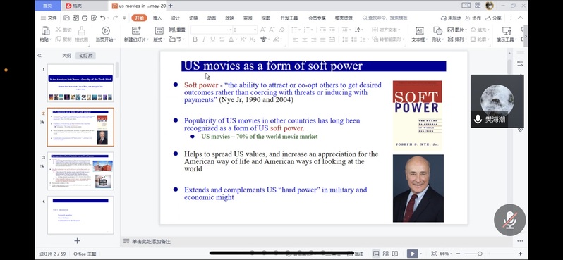 讲座围绕着“贸易冲突的意外后果:特朗普关税和美国的软实力”展开,樊老师先是对比了中美软实力现状,接着介绍了中美软实力的各自特点,紧接着简述在美对华贸易战的背景下,美国电影、运动品牌、旅游目的地等的消费状况。最后得出结论:对美国电影的反感似乎至少会持续到2021年,但是富人所受影响相对较弱。会议最后,樊海潮解答了同学与其他老师就相关问题的提问。