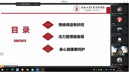 讲座中,但泱泱老师与同学们分享了疫情下进行情绪调适的方式方法,引导同学们识别情绪,评估情绪,在疫情防控形势下安排好个人生活、学习,并介绍了调适情绪的小妙招。但老师通过调查数据、典型案例分析了当前研究生面临的压力,详细阐述了压力如何产生,怎样看待压力,介绍了应对压力的思路和方法。最后,但老师提醒同学们关注身心健康,学会识别心理危机,掌握心理危机的应对方法,在遇到困难时学会及时求助。