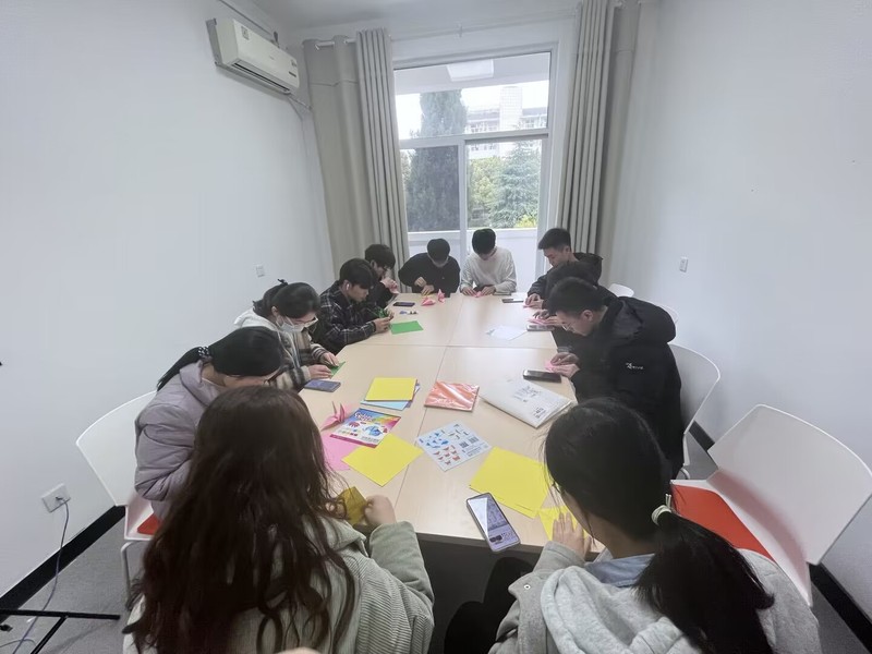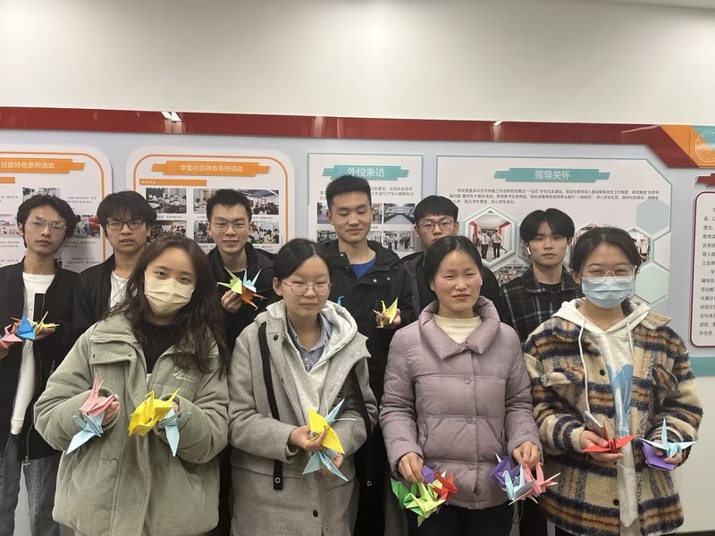 活动伊始,负责人为同学们分发了手工制作的材料,通过视频展示、现场操作的方式教授大家折叠千纸鹤的方法。同学们在折纸上写上对三里街凤阳一村快乐儿童家园小朋友们的美好祝愿、个人寄语等,随后同学们将手中的彩纸折成颜色各异的千纸鹤,现场氛围活跃,同学们相互分享自己的作品,交流心得,留下合影。