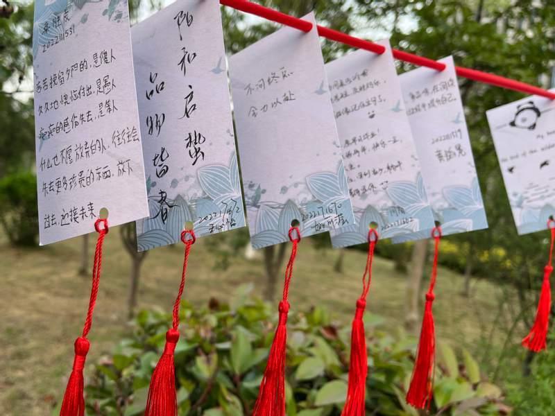 活动初期,必赢优惠y272net学生们被邀请在精心设计的书签上写下自己的感想和对未来的期盼。大家或引用名家名言,或原创诗歌短文,或挥动手中画笔,写下了“五颜六色”的大学生心声。“5·25”全国大学生心理健康日当天,学生们将收集的书签布置在翡翠湖校区科教楼前的人行道旁。路过的同学也纷纷驻足观看,写下了自己的所思所感。