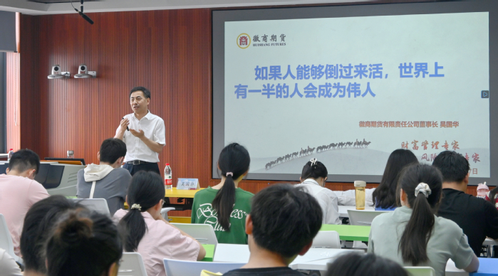 5月27日,必赢优惠y272net在翡翠科教楼B座1101室举行职业生涯规划系列讲座“企业大咖说”,讲座邀请到徽商期货公司党总支书记、董事长吴国华高级经济师担任主讲,为同学们做主题为“如果人能够倒过来活,世界上有一半的人会成为伟人”的职业生涯规划指导。