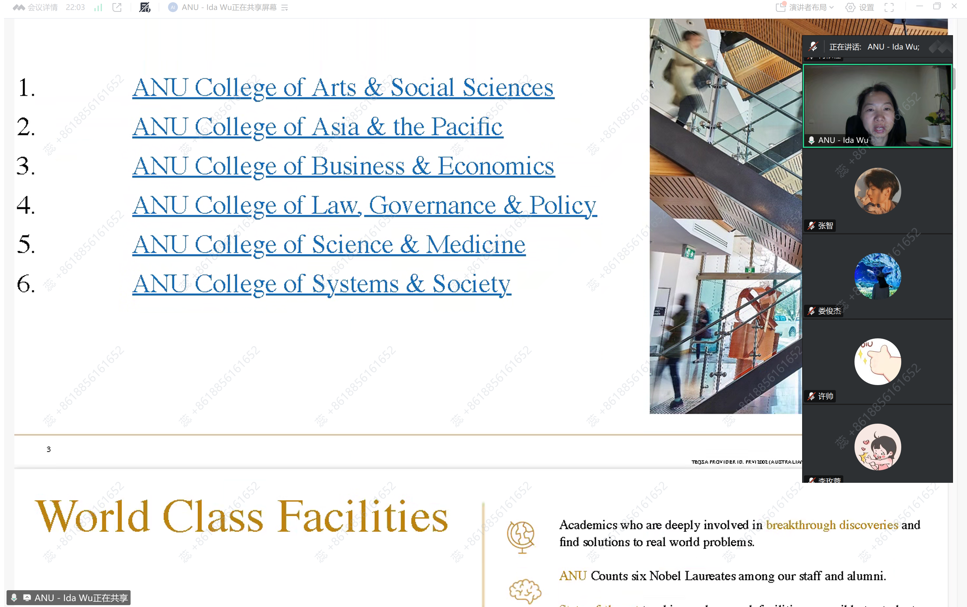 会上,Ida老师通过生动的案例和丰富的数据,系统介绍了澳大利亚国立大学及其克劳福德公共政策学院的概况,并重点解读了研究生课程证书项目的课程设置、就业前景与申请条件。互动环节中,同学们围绕生活适应、实习机会、就业指导等话题提问,Ida老师均给予了详尽解答,现场气氛热烈。