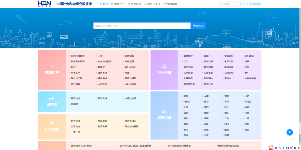 中国社会科学研究数据库是覆盖社会科学研究多领域、跨学科、全维度的事实性数值型数据平台,通过高度密集的统计数据来全面、系统、连续地记录经济、社会等各方面发展情况。涵盖经济、人口、财政、就业、人民生活、教育、科技、文化、体育、卫生等主要经济社会指标,医药生物、食品饮料、农林牧渔、化工、文教体娱、公用事业、电子电器、物流发展、粮食产业等主要行业产业指标,以及数字经济、新质生产力、乡村振兴、中医药产业高质量发展、防灾减灾、低空经济、气象气候、社科基金、绿色经济、专利创新等热点专题数据,“一带一路”数据、黄河流域发展数据等。