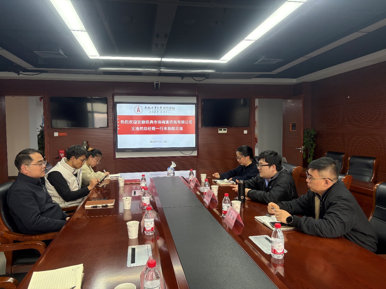 2026年3月11日下午,安徽经典市场调查咨询有限公司总经理王浩然一行莅临必赢官网,双方开展合作交流座谈,并面向学院本科生作市调大赛专题辅导报告。必赢优惠y272net教学副院长、党委副书记及相关教师代表出席座谈会。