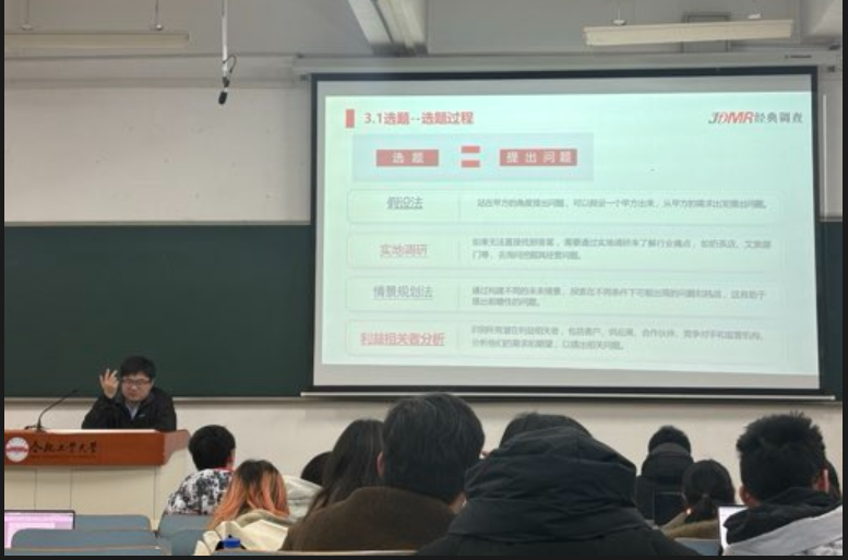 座谈会后,围绕第16届市调赛的参赛要点、规范流程及评分细则等,王浩然为全院本科生开展了新文科创新创业人才培养专题报告。他从选题策划、调研设计、数据采集与分析的全流程切入,逐一拆解参赛环节的关键评判规则。以“案例解析+问题对标”的方式,让学生直观了解大赛评审偏好,清晰把握“精准选题、科学设计、严谨论证、实效对策”的参赛核心逻辑。 同时,王浩然结合参赛过程中出现的高频问题,从“避免选题空泛、调研设计脱离实际、数据支撑不足、报告与调研脱节”等痛点入手,给出了具体的规避策略与优化路径,帮助学生有效找准备赛的发力点。