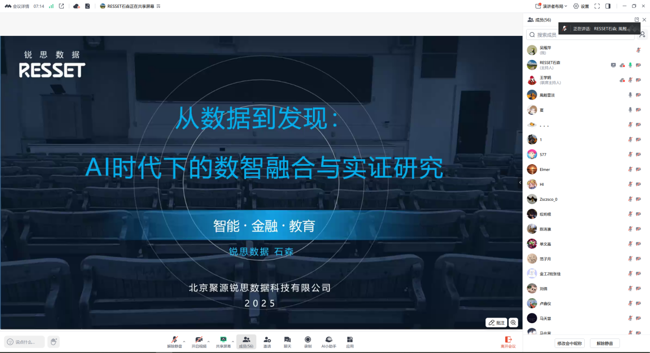 在讲解RESSET数据平台时,石森老师从实证论文写作的角度切入,详细拆解了从数据获取到模型构建的完整流程——如何借助平台快速定位与研究主题匹配的变量指标,如何精准筛选样本、提取数据;并展示了如何运用自然语言处理技术对海量财经文本开展词频分析、情感分析与主题挖掘,为非结构化数据的实证研究开辟了全新路径。